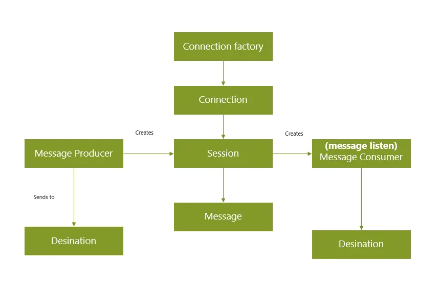 消息生产者由 Session 创建并用于将消息发送到 Destination。 消费者可以同步(阻塞模式) 或异步(非阻塞模式)接收队列和主题类型的消息。消息生产者有两种类型: QueueSender 和