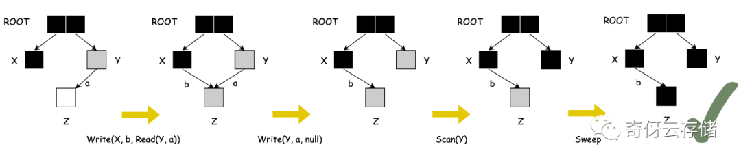 - 条件2:从灰色对象出发,最终到达该白色对象的所有路径都被赋值器破坏(换句话说,这个已经被黑色指向的白色对象,还没有在灰色对象的保护下)