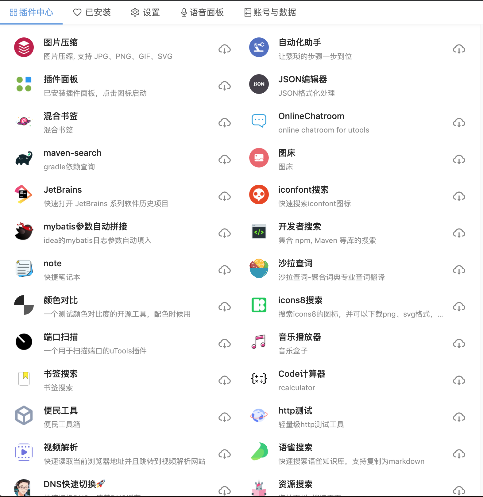 uTools 有自己的插件应用商店,对于开发者来说是一个非常好的效率工具,可以到插件中心添加自己想要的插件进行安装