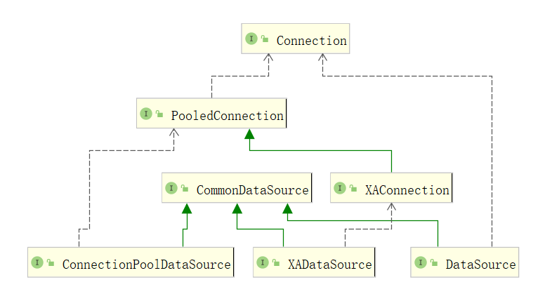 - ConnectionPoolDataSource,连接池实现,这个数据源并不会直接创建数据库物理连接,而是一个逻辑实现,它的作用在于池化数据库物理连接。由于数据库物理连接是一个重量级的对象,频繁的创建销毁很影响性能,将物理连接池化后可降低创建和销毁的频率,复用连接以充分利用连接资源。