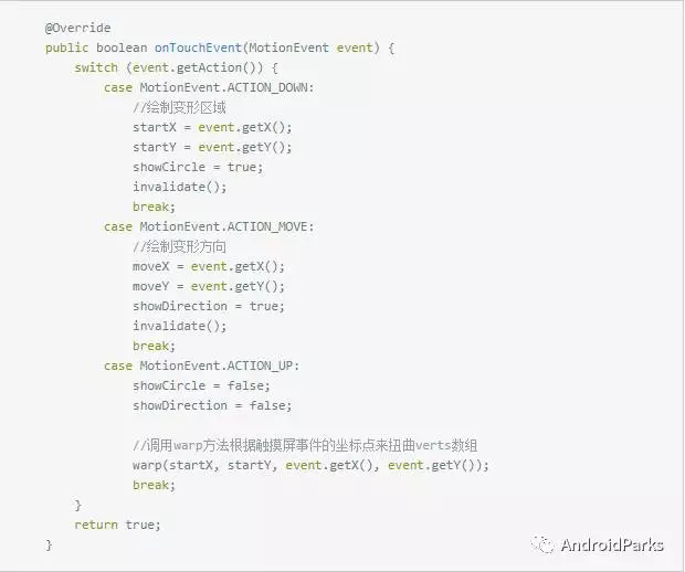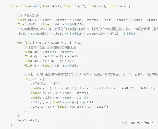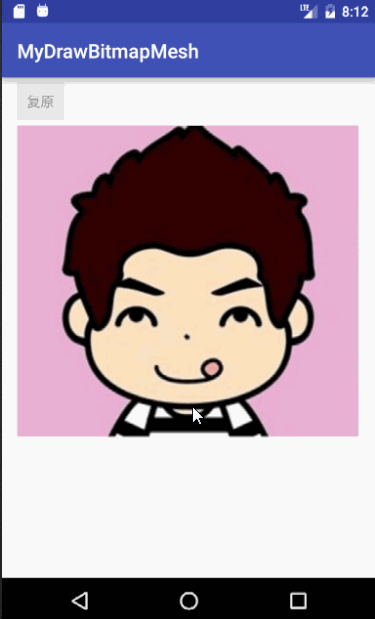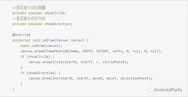 然后就是将 verts[] 数组里面的坐标值进行一系列的自定义的修改。这里对 verts[] 数组的修改直接体现在图像的显示效果,各种图像特效的处理关键就在于此。比如这篇文章对 verts[] 数组的修改是实现图像局部约束变形效果。接着,我们将在onDraw()方法里,将修改过的 verts[] 数组重新绘制一遍,代码如下: