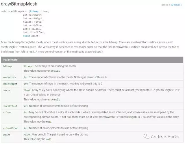先来看看 Android API 中对 drawBitmapMesh 方法的介绍: