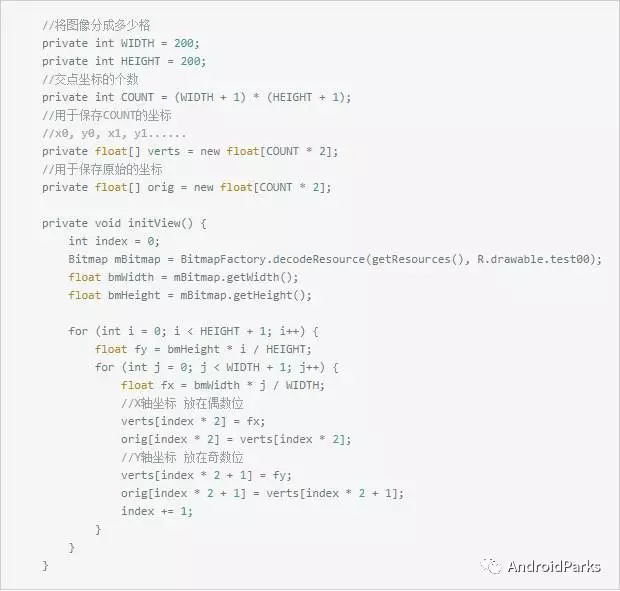 而 drawBitmapMesh() 方法改变图像的方式,就是通过改变这个 verts 数组里的元素的坐标值来重新定位对应的图像块的位置,从而达到图像效果处理的功能。从这里我们就可以看得出来,借用 Canvas.drawBitmapMesh() 方法可以实现各种图像形状的处理效果,只是实现起来比较复杂,关键在于计算、确定新的交叉点的坐标。