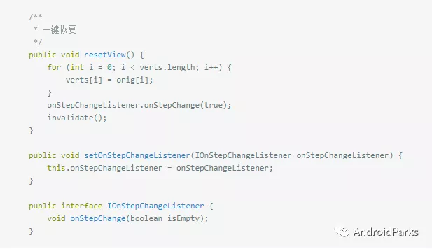 还记得上面提到最初获取分割图片的交叉点的坐标,我们将原始坐标保存在了 orig[] 数组中。这里,当我们点击复原按钮,我们就将 orig[] 数组的值赋给 verts[] 数组,然后重新绘制即可,很简单,添加一个接口监听即可,然后在 MainActivity 中调用一下,代码如下: