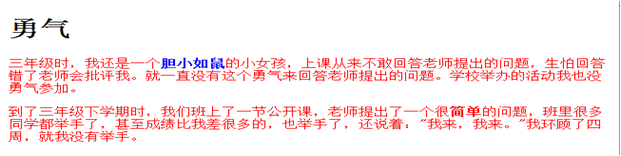 <p class="first">三年级时,我还是一个<strong>胆小如鼠</strong>的小女孩,上课从来不敢回答老师提出的问题,生怕回答错了老师会批评我。就一直没有这个勇气来回答老师提出的问题。学校举办的活动我也没勇气参加。
