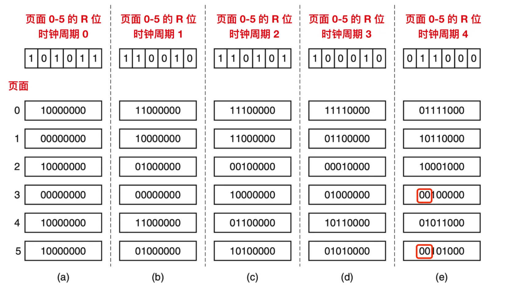 可以用 R 位和 M 位来构造一个简单的页面置换算法:当启动一个进程时,操作系统将其所有页面的两个位都设置为 0。R 位定期的被清零(在每个时钟中断)。用来将最近未引用的页面和已引用的页面分开。