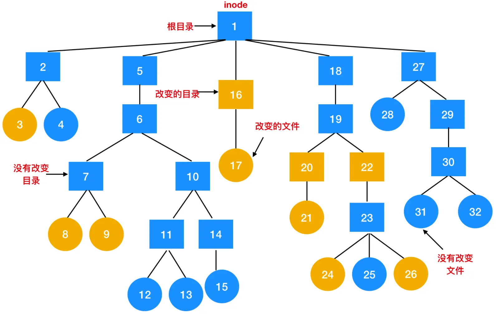 待转储的文件系统,其中方框代表目录,圆圈代表文件。黄色的项目表是自上次转储以来修改过。每个目录和文件都被标上其 inode 号。