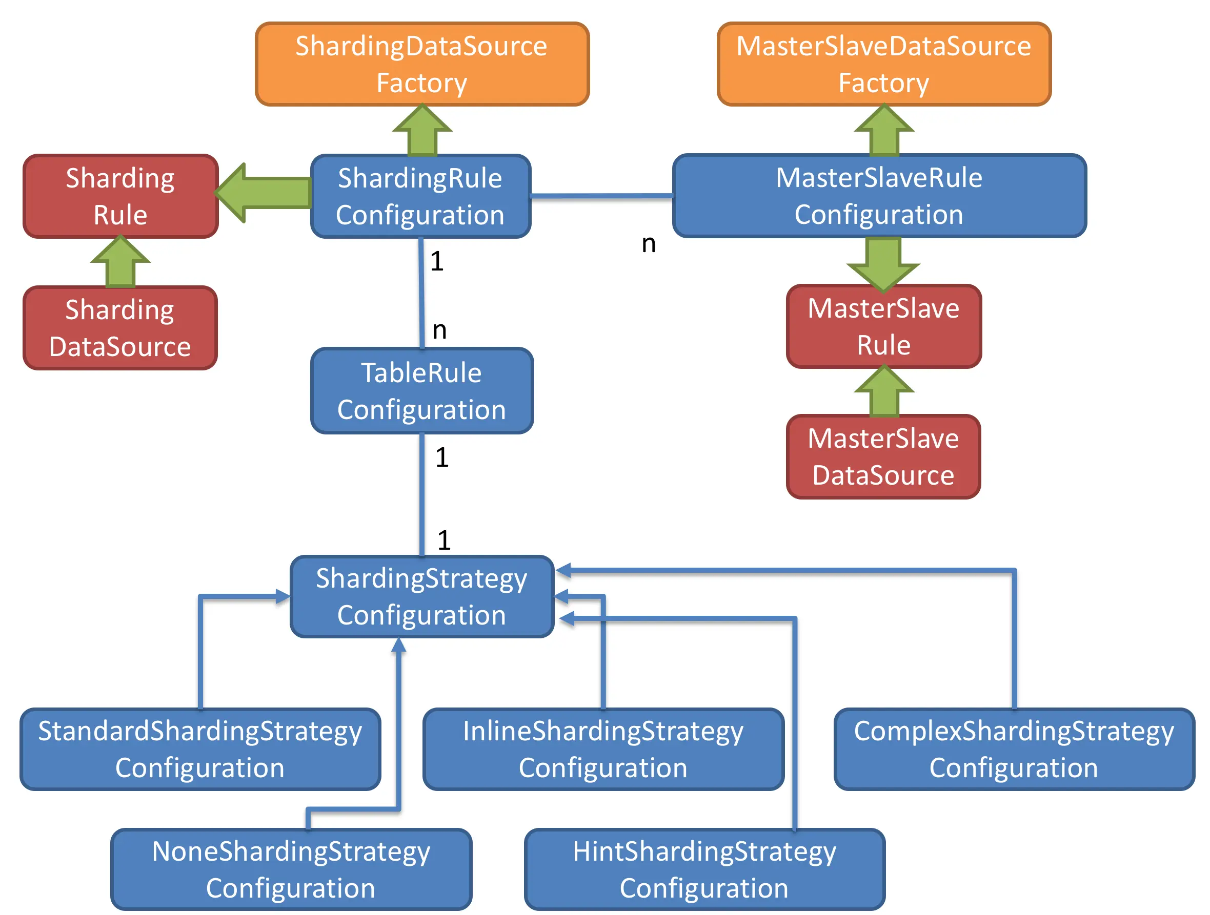 图中红色部分表示的是内部对象,由Sharding-JDBC内部使用,应用开发者无需关注。Sharding-JDBC通过ShardingRuleConfiguration和MasterSlaveRuleConfiguration生成真正供ShardingDataSource和MasterSlaveDataSource使用的规则对象。ShardingDataSource和MasterSlaveDataSource实现了DataSource接口,是JDBC的完整实现方案。