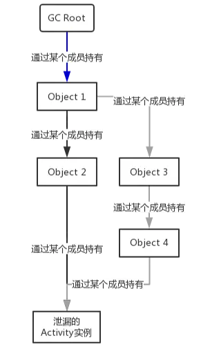 在分析阶段,由于对 Activity 的强引用链很可能不止一条,因此问题的关键在于找到最短的引用链。比如有如下引用关系: