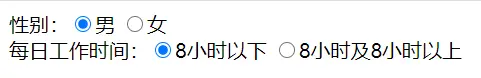 每日工作时间:<input type="radio" name="time" />8小时以下 <input type="radio" name="time" />8小时及8小时以上