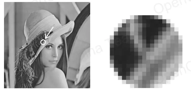 - 当我们把上图左侧图像中箭头所指的圆形区域放到可看到右侧图像,可以看到灰度深浅不一的小方格,每个小方格就是一个像素