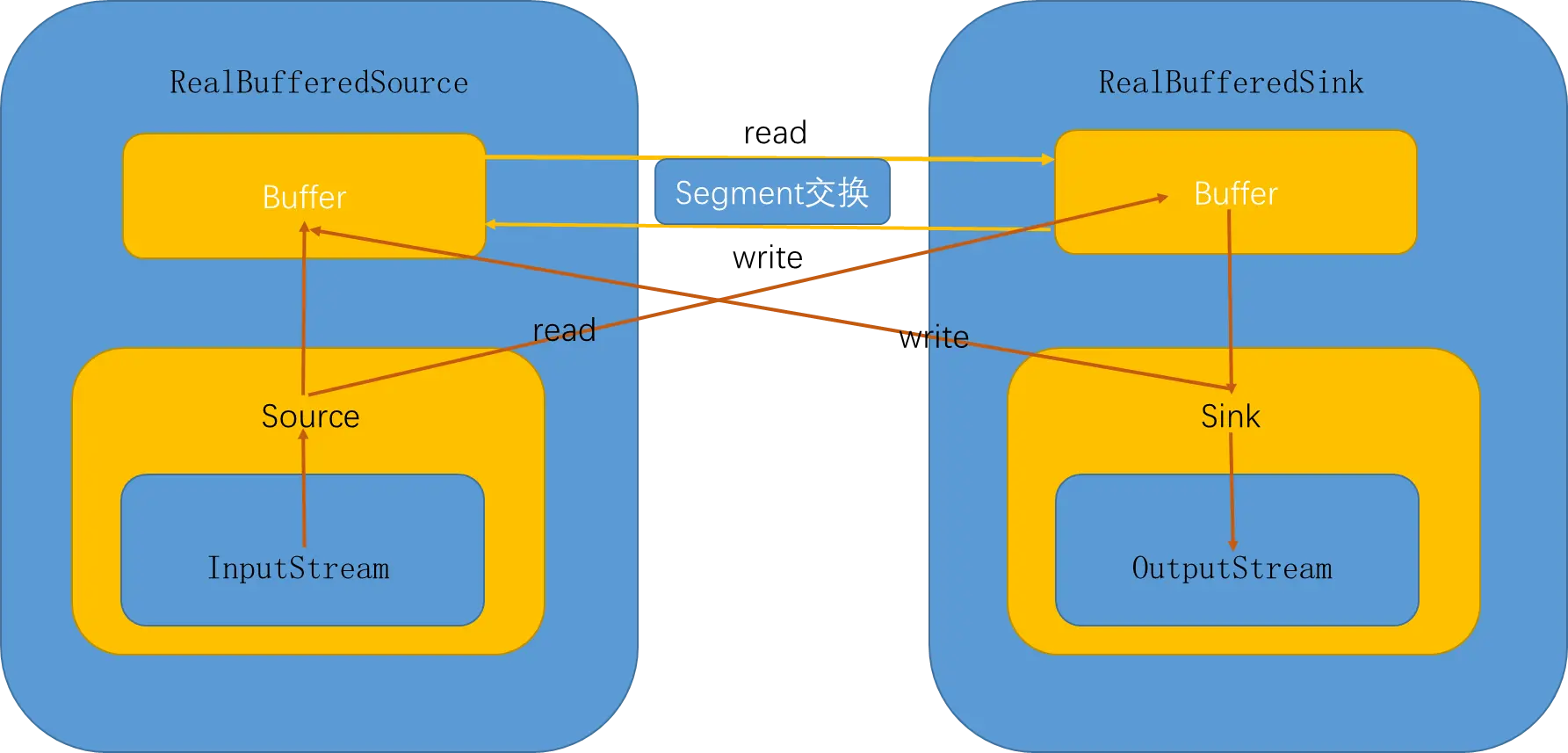 - RealBufferedXxx,这两个流类,实现了缓存数据存储在Buffer中,而且IO读取至少是Segment.SIZE的大小(暂时为8KB)
