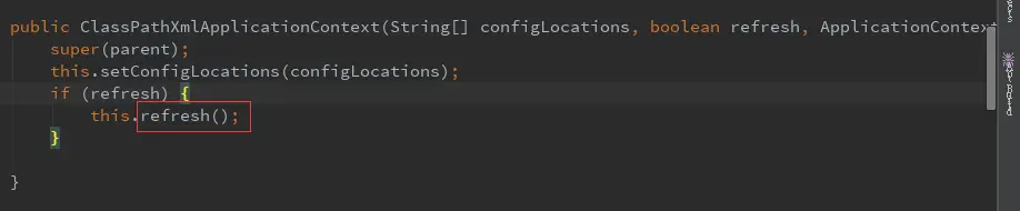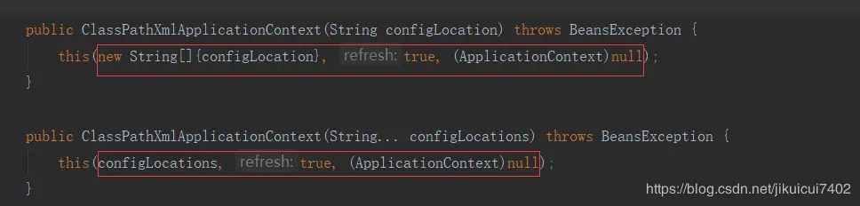 ClassPathXmlApplicationContext context = new ClassPathXmlApplicationContext("config.xml"); 调用只会是上述两个方法其中一个,这里明显是ClassPathXmlApplicationContext(String configLocation)