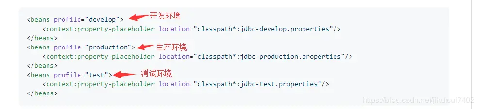 Spring Profile特性是从3.1开始的,其主要是为了解决这样一种问题: 线上环境和测试环境使用不同的配置或是数据库或是其它。有了Profile便可以在 不同环境之间无缝切换。**Spring容器管理的所有bean都是和一个profile绑定在一起的。**使用了Profile的配置文件示例: