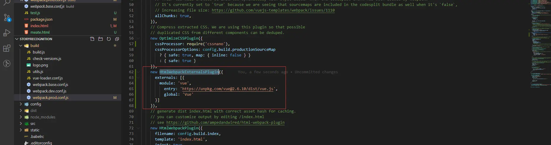 - 在webpack.prod.conf.js 文件中增加插件配置如下