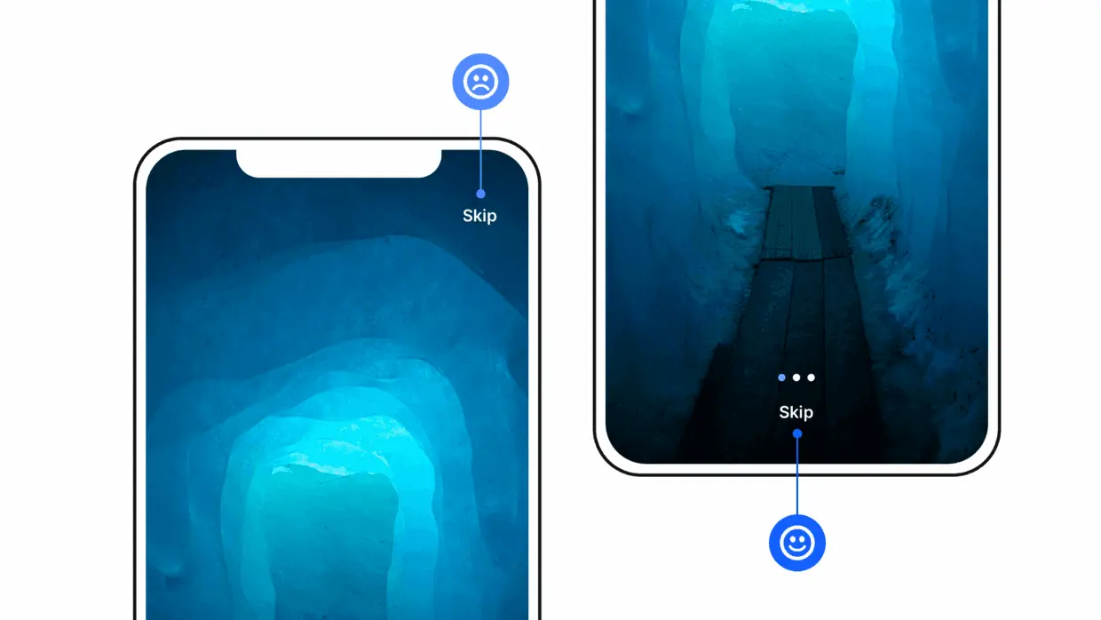 但是!并不是每个用户都有看完教程的必要,在界面中提供「跳过」选项,让用户拥有选择的权利,同时,这个「跳过」按钮尽量在界面的底部,毕竟在这个大屏当道的时代,手指最便捷的交互区域主要集中在屏幕底部。