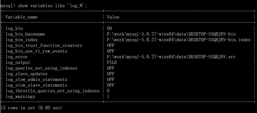 我这里就没有配置前缀名,所以有点难看,log_bin为on的话就配置成功了;