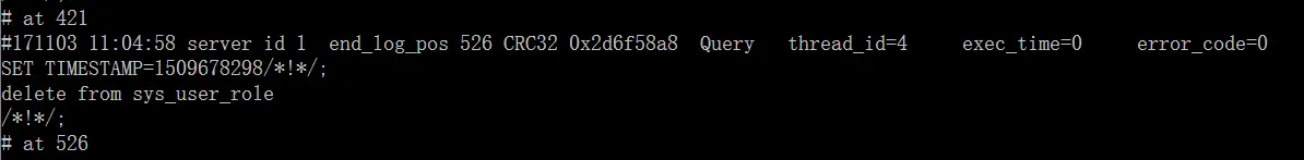 位于文件中的位置,“at 421”说明“事件”的起点,是以第421字节开始;“end_log_pos 526”说明以第526字节结束时间戳