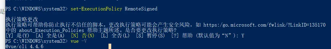 通过伟大的搜索引擎找到了解决方法 PowerShell以管理员身份运行,在里面输入set-ExecutionPolicy RemoteSigned,回复Y,再次运行vue -V就可以使用了