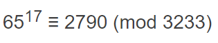 爱丽丝的公钥是 (3233, 17),鲍勃的m假设是65,那么可以算出下面的等式: