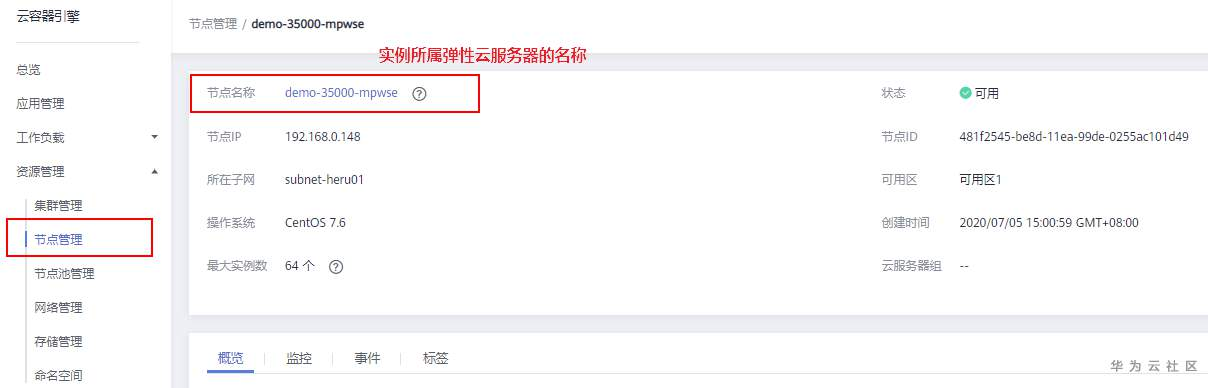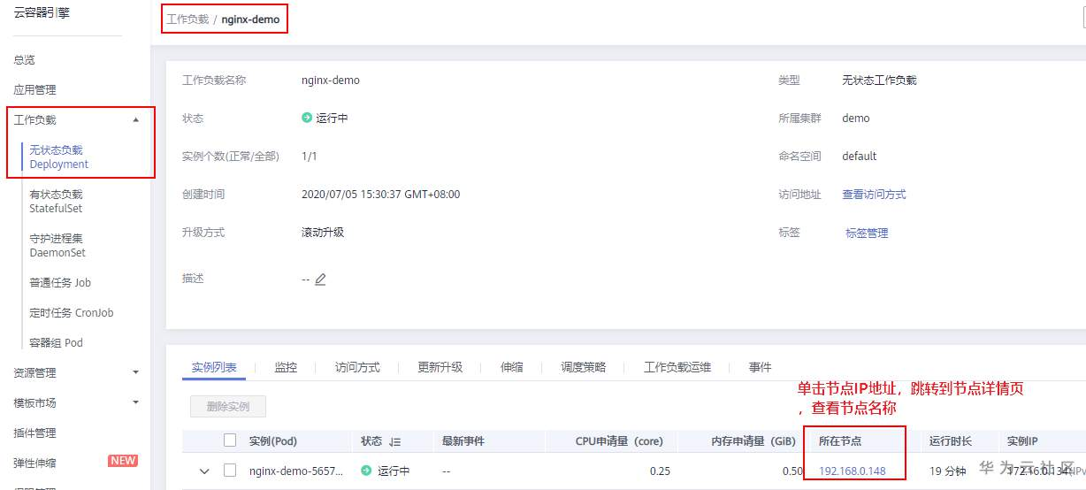 在通过API网关将容器的工作负载对外开放前,需要在CCE服务控制台获取如下图所示信息,创建好集群和工作负载。注意工作负载的访问方式,需配置为“节点访问”。