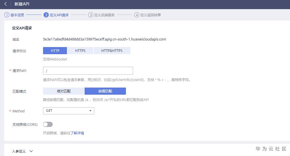 在“定义API请求”界面,输入如下图所示信息。