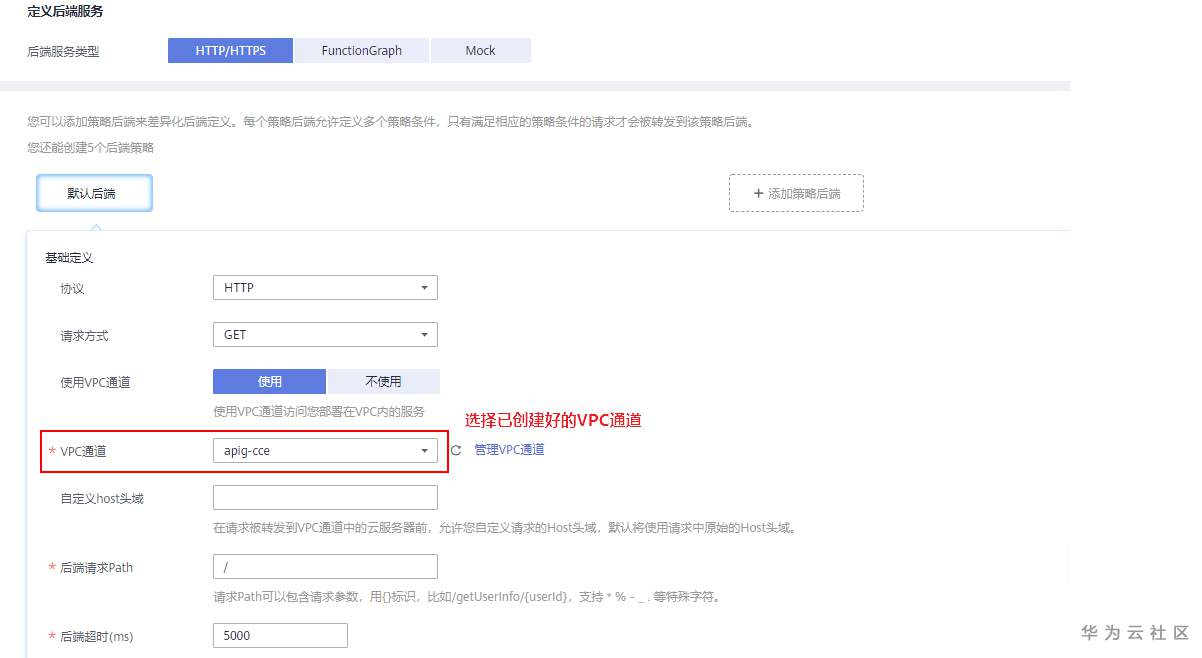 在“定义后端服务”界面,输入如下图所示信息。