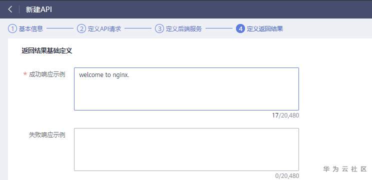在“返回结果基础定义”界面,输入“成功响应示例”,在本示例中,输入内容仅供参考,无实际作用。单击“完成”,完成API的创建。