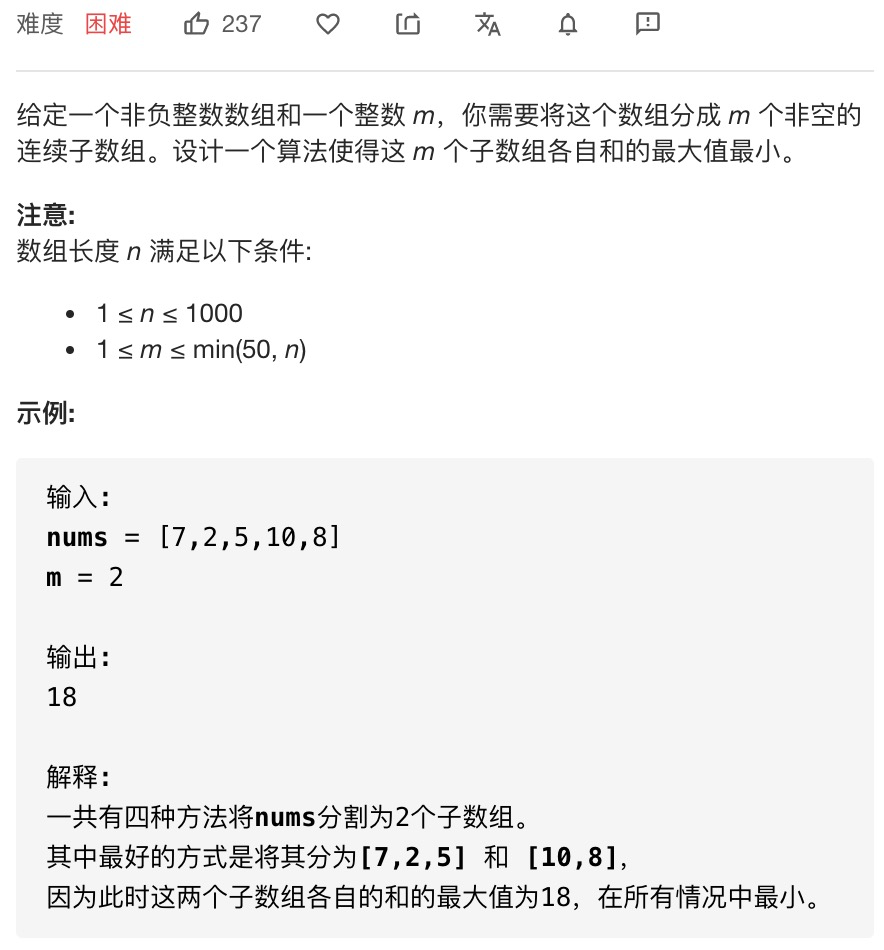 我们发现,两个子数组可以将整个数组元素放入,而 count 刚好等于 m,因此 [7,2,5] 和 [10, 8] 就是分割出来的两个子数组,最小的最大值为 18。