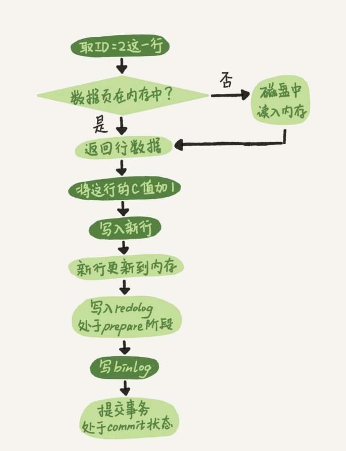 假设当前ID=2的行,字段c的值是0,执行pdate T set c=c+1 where ID=2;这条语句。