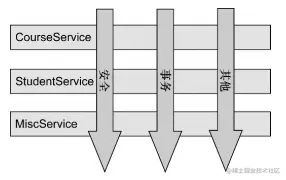 上图展现了一个被划分为模块的典型应用。每个模块的核心功能都是为特定业务领域提供服务,但是这些模块都需要类似的辅助功能,例如安全和事务管理。 如果要重用通用功能的话,最常见的面向对象技术是继承(inheritance)或委托(delegation)。但是,如果在整个应用中都使用相同的基类, 继承往往会导致一个脆弱的对象体系;而使用委托可能需要对委托对象进行复杂的调用。