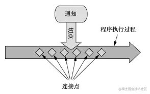 描述切面的常用术语有通知(advice)、切点(pointcut)和连接点(join point)。下图展示了在一个或多个连接点上,可以把切面的功能(通知)植入到程序的执行过程中。