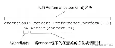 现在假设我们需要配置的切点仅匹配concert包。在此场景下,可以使用within()指示器来限制匹配,如下图:
