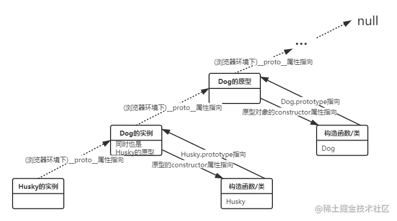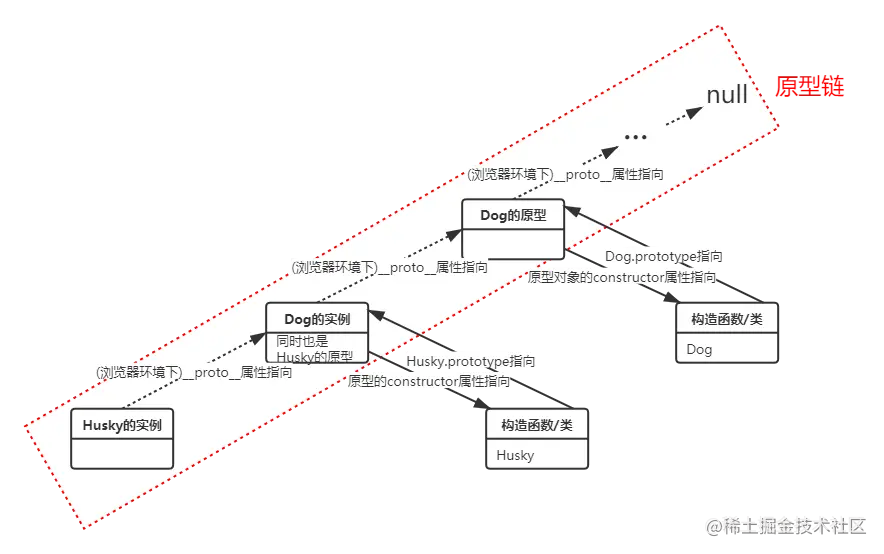 读取对象的属性时,先查找对象本身的属性,如果没有,就到它的原型以及原型的原型去找。如果直到最顶层的null还是找不到,则返回undefined。这条查找链上的所有对象构成原型链。