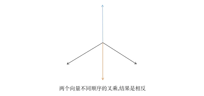 V1 叉乘 V2 -- V2 叉乘 V1,它们的结果都会是垂直与V1,V2组成的平面,但是结果是指向相反方向的向量.