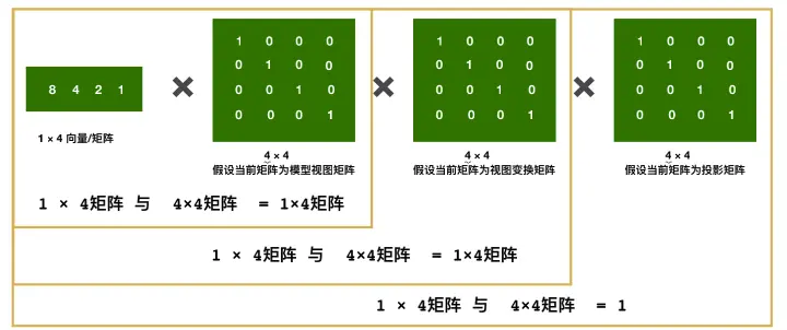 变换后的顶点向量 = 顶点 * 模型矩阵 * 视图矩阵 * 投影矩阵;