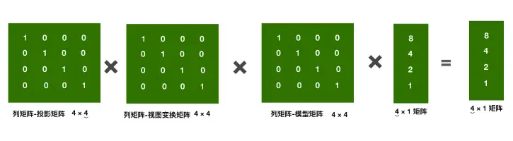 变换后的顶点向量 = 投影矩阵 * 视图矩阵 * 模型矩阵 * 顶点;