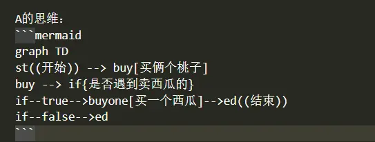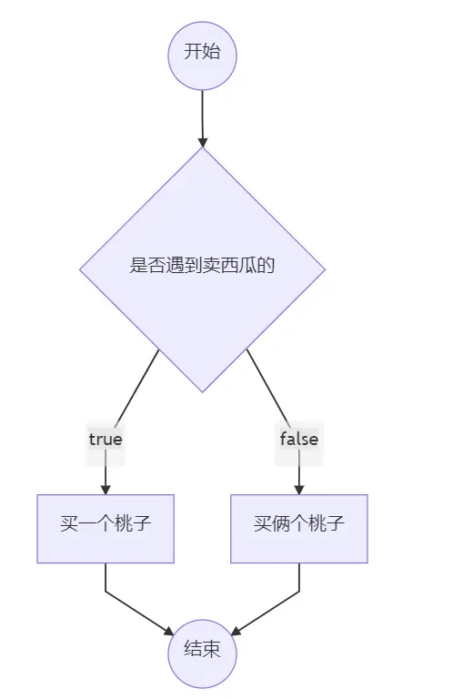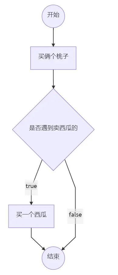 我们来举一个经典的买桃子和卖西瓜的例子。A给B说,去买俩个桃子吧,如果遇到卖西瓜的话就买一个,用流程图画出来。