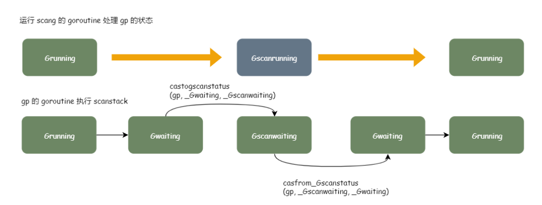 func scang(gp *g, gcw *gcWork) { // 栈扫描是否完成的标识 gp.gcscandone = false // 轮询的时长间隔 const yieldDelay = 10 * 1000 var nextYield int64// 循环loop: for i := 0; !gp.gcscandone; i++ { // 读取 goroutine 的状态标识; switch s := readgstatus(gp); s { default: dumpgstatus(gp) throw("stopg: invalid status") // 如果是已经释放的 goroutine,那么跳出; case _Gdead: // No stack. gp.gcscandone = true break loop // 拷贝栈的过程,等一下,稍后需要重试; case _Gcopystack: // Stack being switched. Go around again. // 如果该是 goroutine 是已经挂起的状态(非运行状态) case _Grunnable, _Gsyscall, _Gwaiting: // 重要:设置扫描标识(GScan)这个标识会阻塞该 goroutine 的运行,直到栈扫描完成; if castogscanstatus(gp, s, s|_Gscan) { if !gp.gcscandone { // 调用 scanstack 扫描栈 scanstack(gp, gcw) gp.gcscandone = true } // 重启 goroutine ,这个 goroutine 又可以继续跑业务代码了; restartg(gp) break loop } // 如果已经是扫描状态了,那么说明别的地方已经在扫描这个g栈了,等别人完成就好了; case _Gscanwaiting: // newstack is doing a scan for us right now. Wait. // 如果这个 goroutine 是一个 runing 状态,那么需要抢占调度,然后让它自己去扫描 g 栈,现场就等他自己扫描完之后就好了; // 这里只需要设置抢占标识和扫描标识就可以了,真正的扫描现场在这个 gp 自己运行现场; case _Grunning: if gp.preemptscan && gp.preempt && gp.stackguard0 == stackPreempt { break } // 打上 Scan 标识,通知 gp 抢占调度,让它自己扫描栈; if castogscanstatus(gp, _Grunning, _Gscanrunning) { if !gp.gcscandone { // 打上抢占标识 gp.preemptscan = true gp.preempt = true // 设置魔数标识 gp.stackguard0 = stackPreempt } // 设置完抢占标识,就可以把 goroutine 的 Scan 去掉了,下面就是循环等待它自己处理完了; casfrom_Gscanstatus(gp, _Gscanrunning, _Grunning) } } if i == 0 { nextYield = nanotime() + yieldDelay } if nanotime() < nextYield { procyield(10) } else { osyield() nextYield = nanotime() + yieldDelay/2 } } gp.preemptscan = false // cancel scan request if no longer needed}