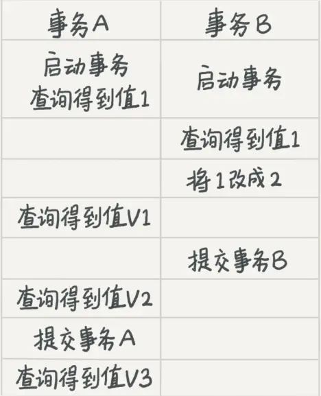 - 读提交 V1的值是1,V2和V3的值都是2,因为事务B的更新只能提交之后才能看到。