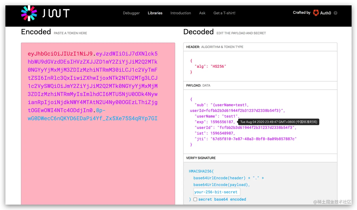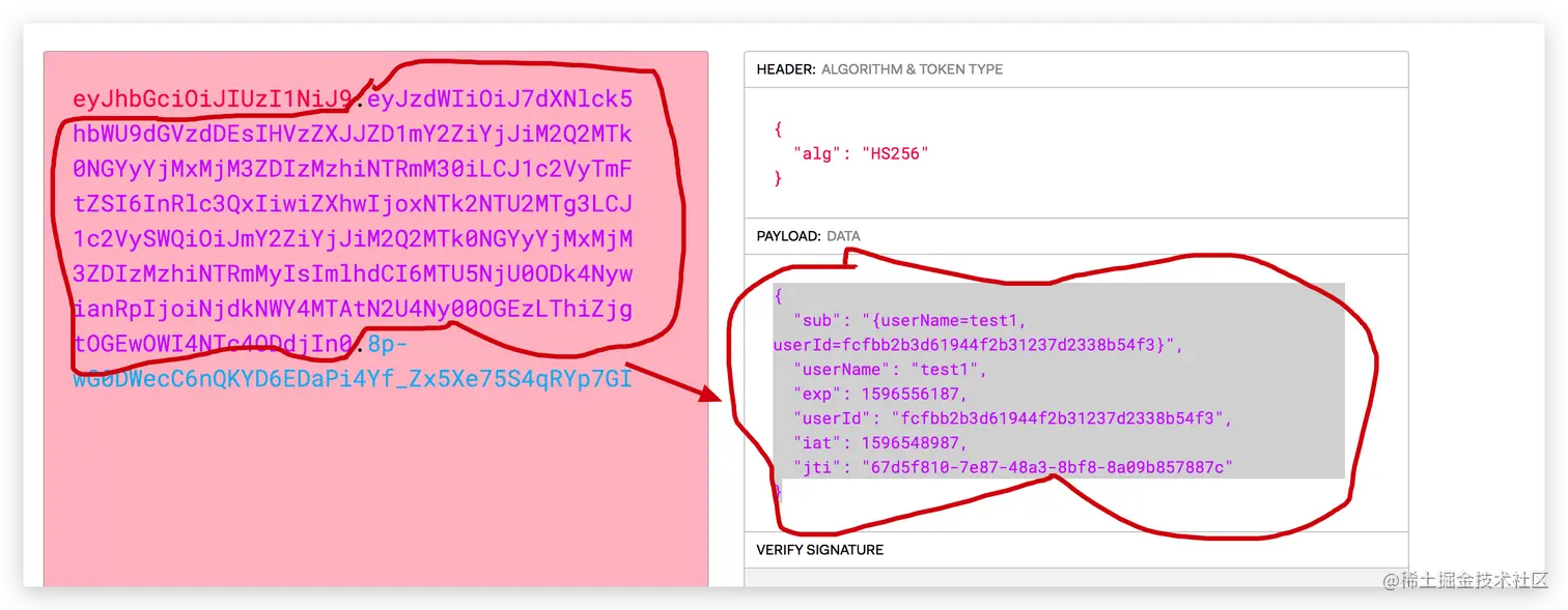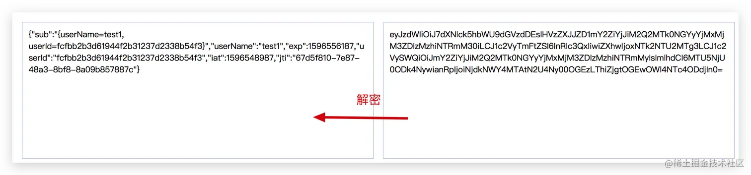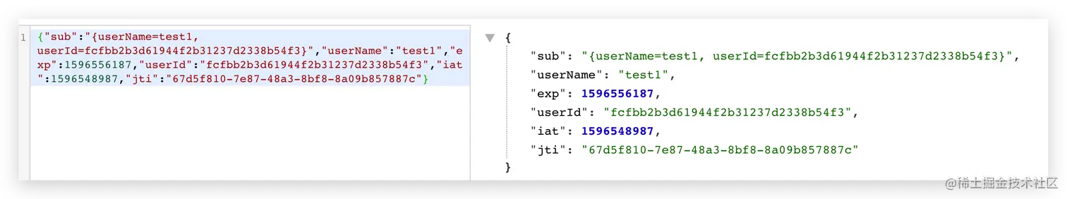 {"sub":"{userName=test1, userId=fcfbb2b3d61944f2b31237d2338b54f3}","userName":"test1","exp":1596556187,"userId":"fcfbb2b3d61944f2b31237d2338b54f3","iat":1596548987,"jti":"67d5f810-7e87-48a3-8bf8-8a09b857887c"}