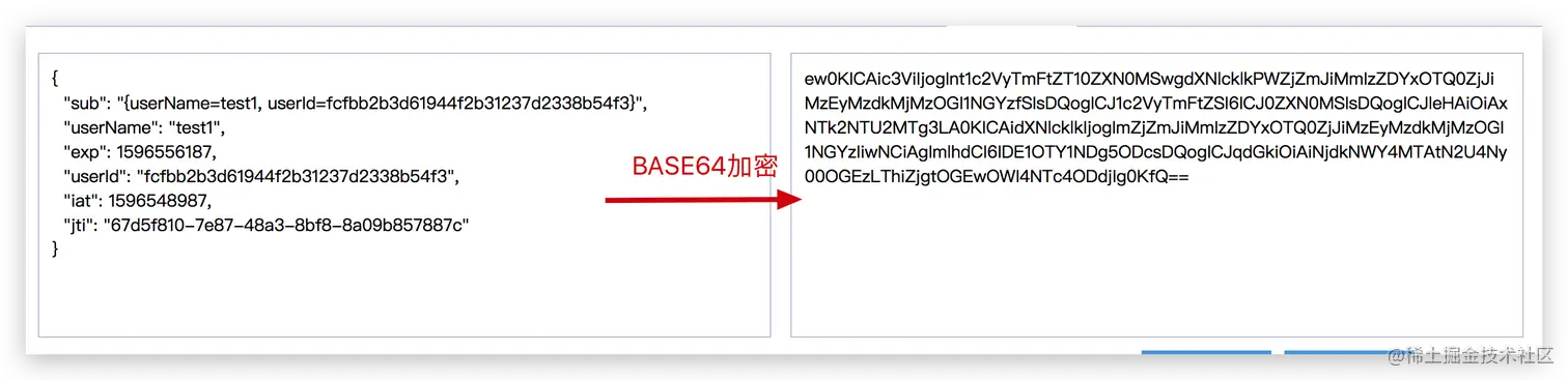 System.out.println(Base64Url.encode(JSON.parseObject("{\"sub\":\"{userName=test1, userId=fcfbb2b3d61944f2b31237d2338b54f3}\",\"userName\":\"test1\",\"exp\":1596556187,\"userId\":\"fcfbb2b3d61944f2b31237d2338b54f3\",\"iat\":1596548987,\"jti\":\"67d5f810-7e87-48a3-8bf8-8a09b857887c\"}")));