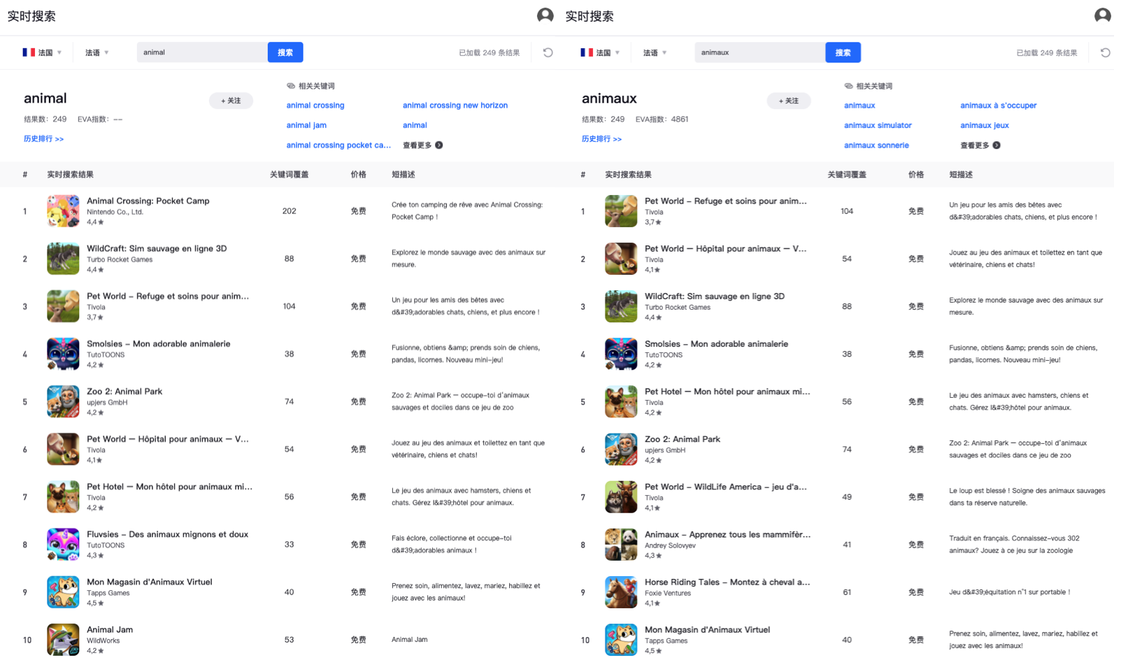 比如, animal法语的单复数形式差别就很大:animal(单数)、animaux(复数)。在法国的Google Play Store上,animal(单数)搜索结果第一名Animal Crossing: Pocket Camp甚至都没有出现在animaux(复数)搜索结果前十。