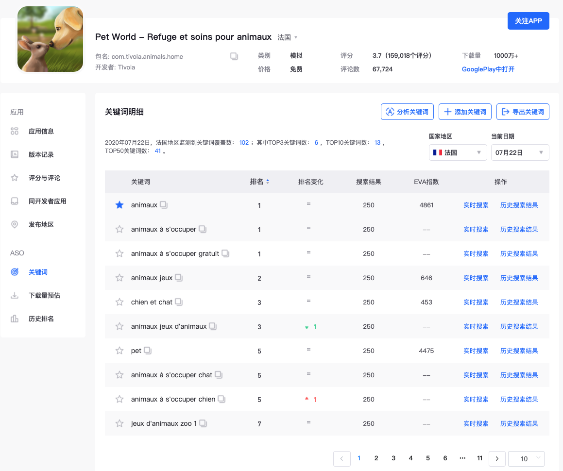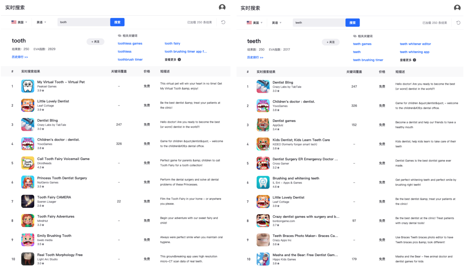 最好先搜索一下这个词的单数和复数形式的排名结果。使用EVA数据的实时搜索功能,你可以看到某个关键词在Google Play Store不同国家的实时搜索结果。