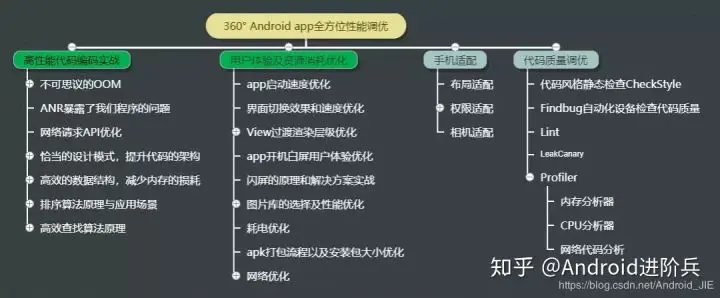 以下是性能优化的思维导图:高性能代码编码实战,是带领大家将代码写起来;用户体验及资源消耗优化,是带领大家从用户体验的角度去修改现有的代码。