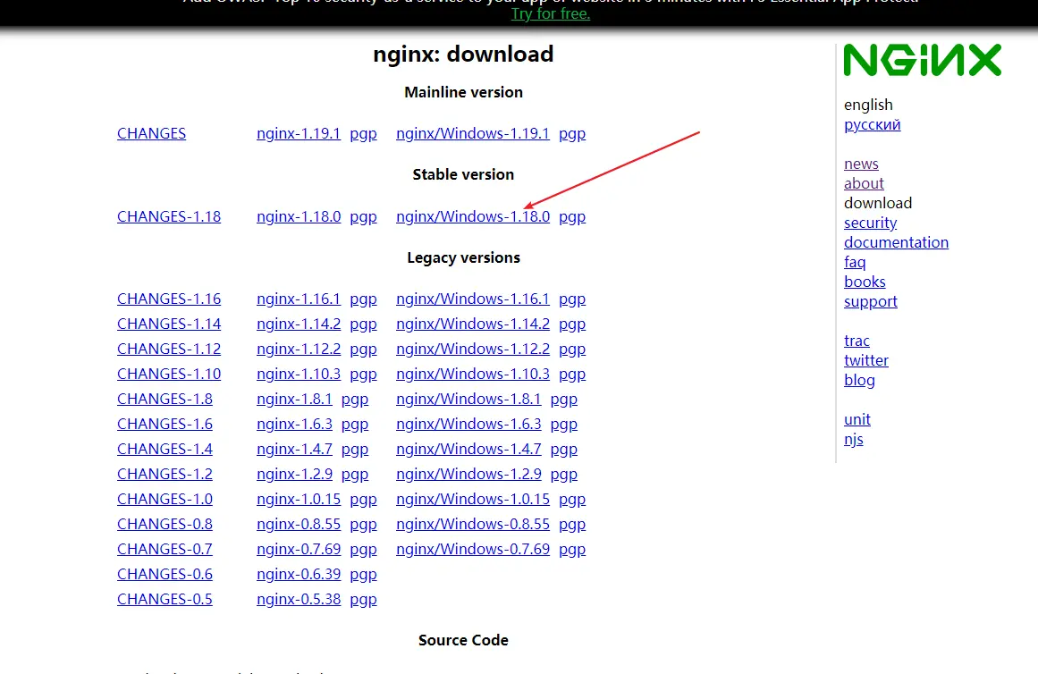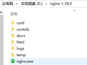 箭头所指为稳定版本,下载下来直接解压,我是放在E:\nginx-1.18.0