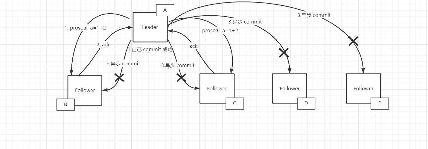 发送给 follower 的由于网络等原因失败了,自己 commit 成功了,正好 Leader 挂了,由于选举新的 Leader 后会删除最新无效的数据所以 B C D E 节点 a = 1,A 节点 a = 3