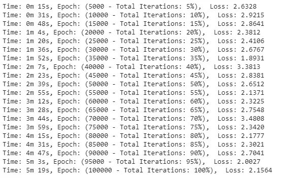print('Time: %s, Epoch: (%d - Total Iterations: %d%%), Loss: %.4f' % (time_taken(start), iter, iter / epochs * 100, loss))