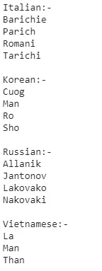 现在,我们将检查样本模型,在给定语言和起始字母时生成名称。