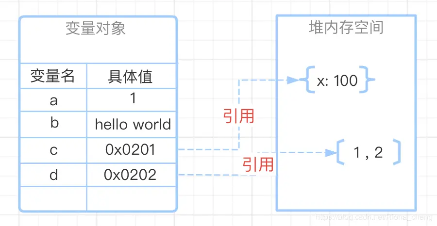 变量对象创建完成后,接下来就是对数据的存储,基础数据类型往往会保存在栈内存中(特殊情况除外),而引用数据类型的值是保存在堆内存中的对象,在js语言中,不允许直接访问堆内存空间中的数据. 当我们操作对象时实际上是在操作对象的引用,而不是实际的对象. 因此,引用数据类型都是按引用访问的,这里的引用可以理解为保存在变量对象中的一个地址,该地址与堆内存中的对象相关联.